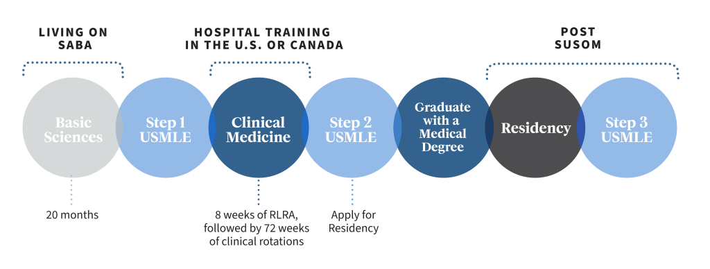 Founded in 1992 on the island of Saba, SUSOM has delivered rigorous medical education and training for 3,500+ graduates. Our MD program features two years of classroom and lab-based learning on our Basic Sciences campus, followed by two years of clinical rotations at affiliated teaching hospitals, clinics and medical centers in the U.S., and select elective rotation sites in Canada. Alumni then go on to achieve residency placements, hold medical licenses and practice across North America!